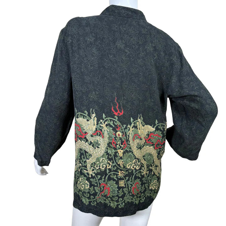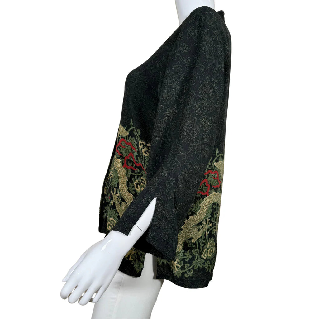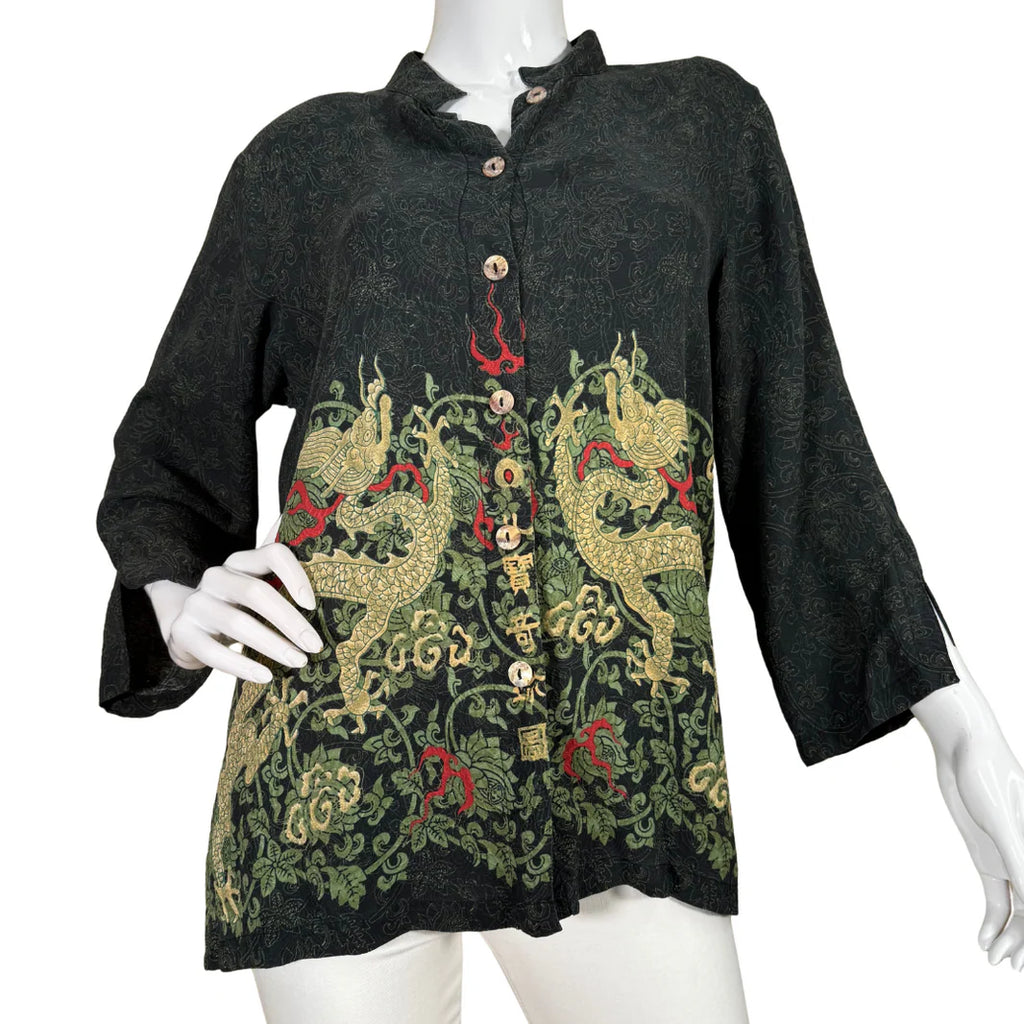 Black Asian-Inspired Button-Up Top with Dragon Embroidery