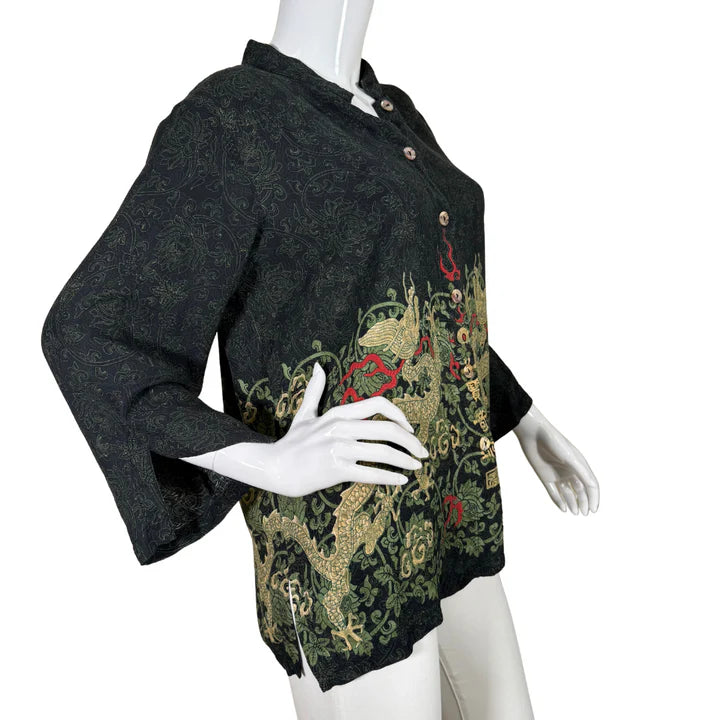 Striking and bold, this Black Asian-Inspired Button-Up Top with Dragon Embroidery is intricately embroidered with golden dragons and lush green foliage accented by red flames, evoking a regal East Asian aesthetic. The blouse features a mandarin collar and natural shell buttons running down the front.