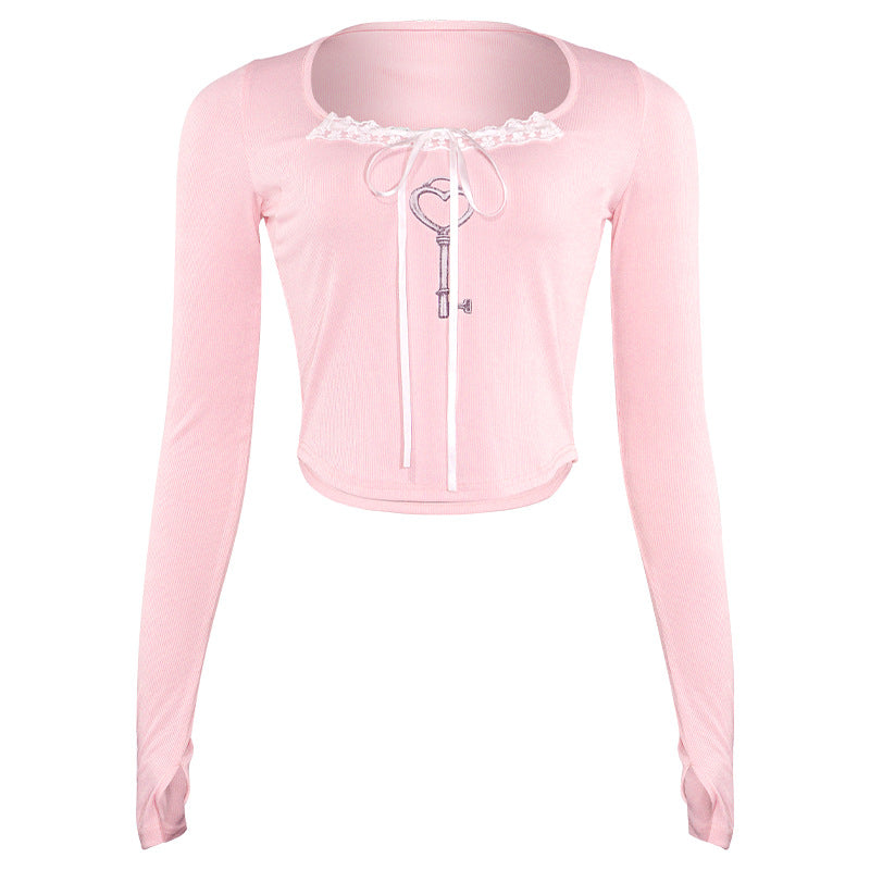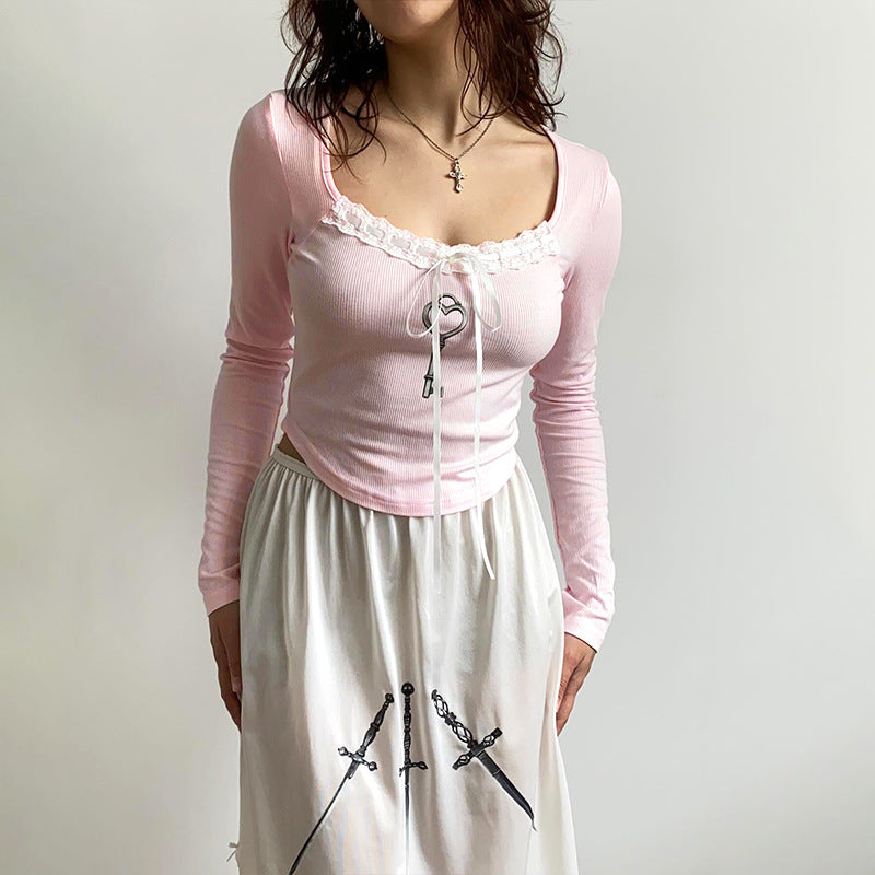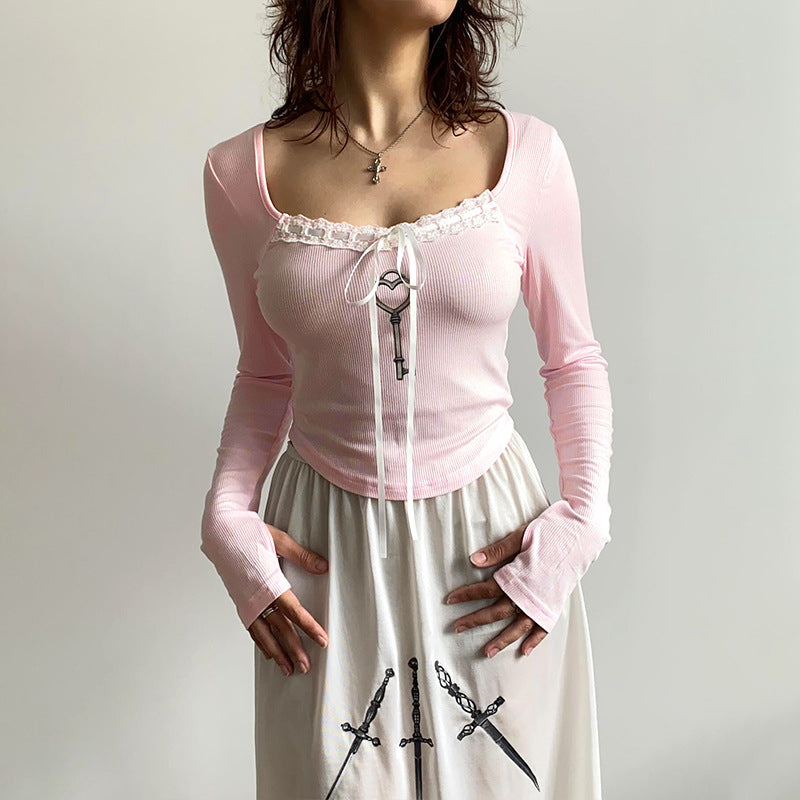 European & American Spicy Girl Autumn New Solid Color Square Neck Long-Sleeve Slim-Fit Bow Short Top