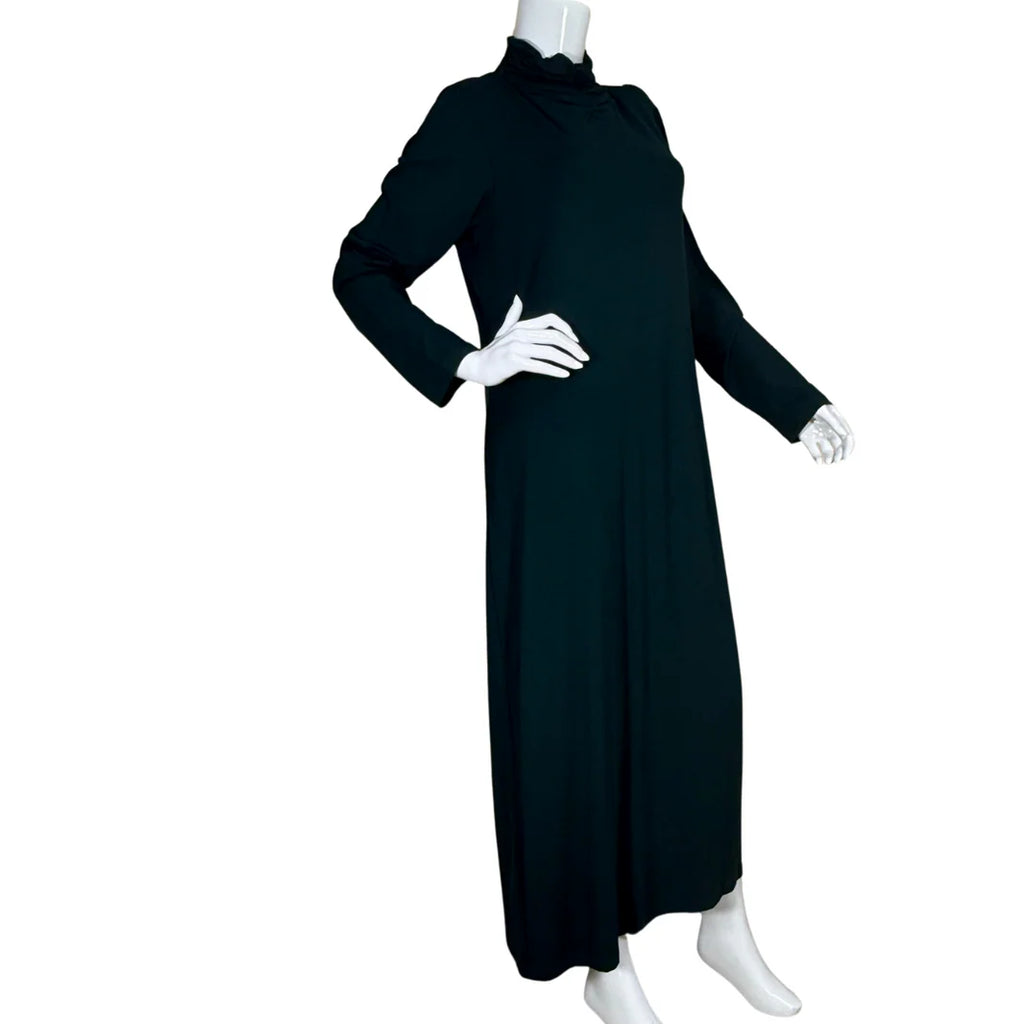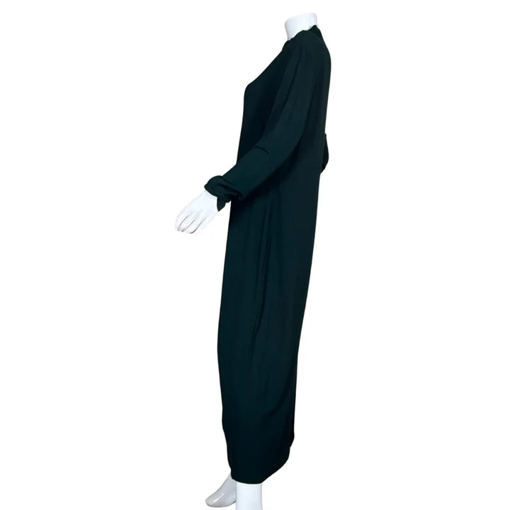 This sophisticated Rich Dark Green Dress is designed with full-length sleeves and a modest high neckline, ideal for cooler weather or more conservative occasions. The dress flows elegantly to the ankles with a relaxed, draped silhouette that offers both comfort and style.